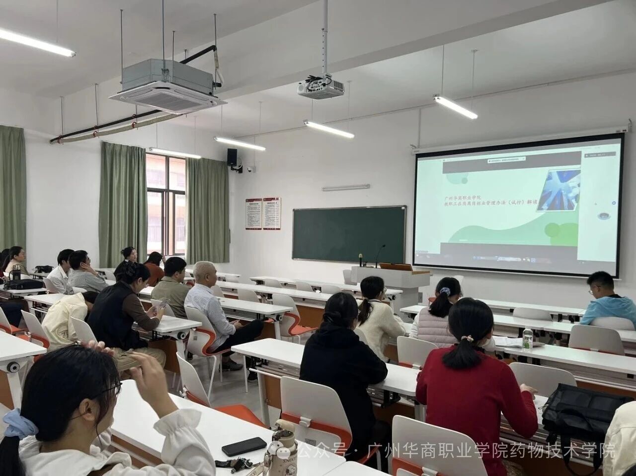 为深入贯彻“依托产业,聚焦岗位,面向世界,服务就业”的办学理念,积极响应学校推动教师在岗离岗创业的号召,我院于12月10日以线上线下相结合的方式,广州校区在博学楼A205,江门校区在文401-2,成功召开药物技术学院两校区全体教师大会,组织深入学习《广州华商职业学院教职工在岗离岗创业管理办法(试行)》。本次会议旨在帮助教师精准把握文件内涵,激发创业潜能,赋能学院高质量发展。孙虎副校长、杨凤琼院长、叶雪兰副院长、蒋锦宏副院长及全体教师共同与会。