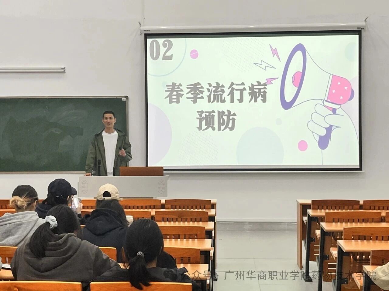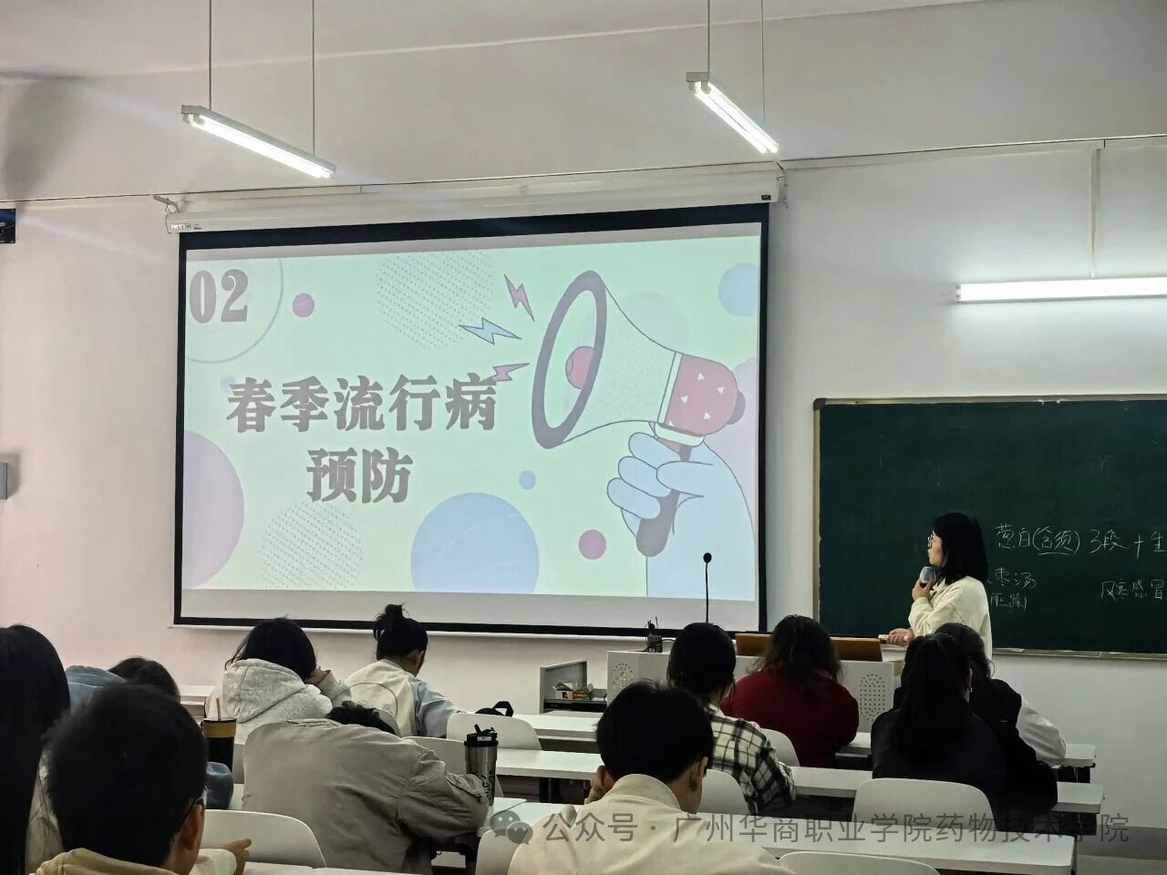 春季是流行病高发期,结合药学专业学生的专业素养培养要求,班会对春季常见流行病预防知识进行了系统讲解。重点介绍流感、水痘等呼吸道传染病,诺如病毒感染性腹泻、细菌性痢疾等消化道传染病,以及花粉症、手足口病等疾病的发病特征与传播途径,并从个人防护、增强免疫力、环境防护三个维度明确核心预防措施。班主任们倡导同学们将专业知识与日常健康防护结合,养成勤洗手、科学佩戴口罩、遵守咳嗽礼仪等良好卫生习惯;通过规律作息、均衡饮食、适度锻炼筑牢自身免疫屏障;做好宿舍通风、清洁消毒等工作,注重个人与公共卫生,以专业的健康认知守护自身和身边同学的身体健康。