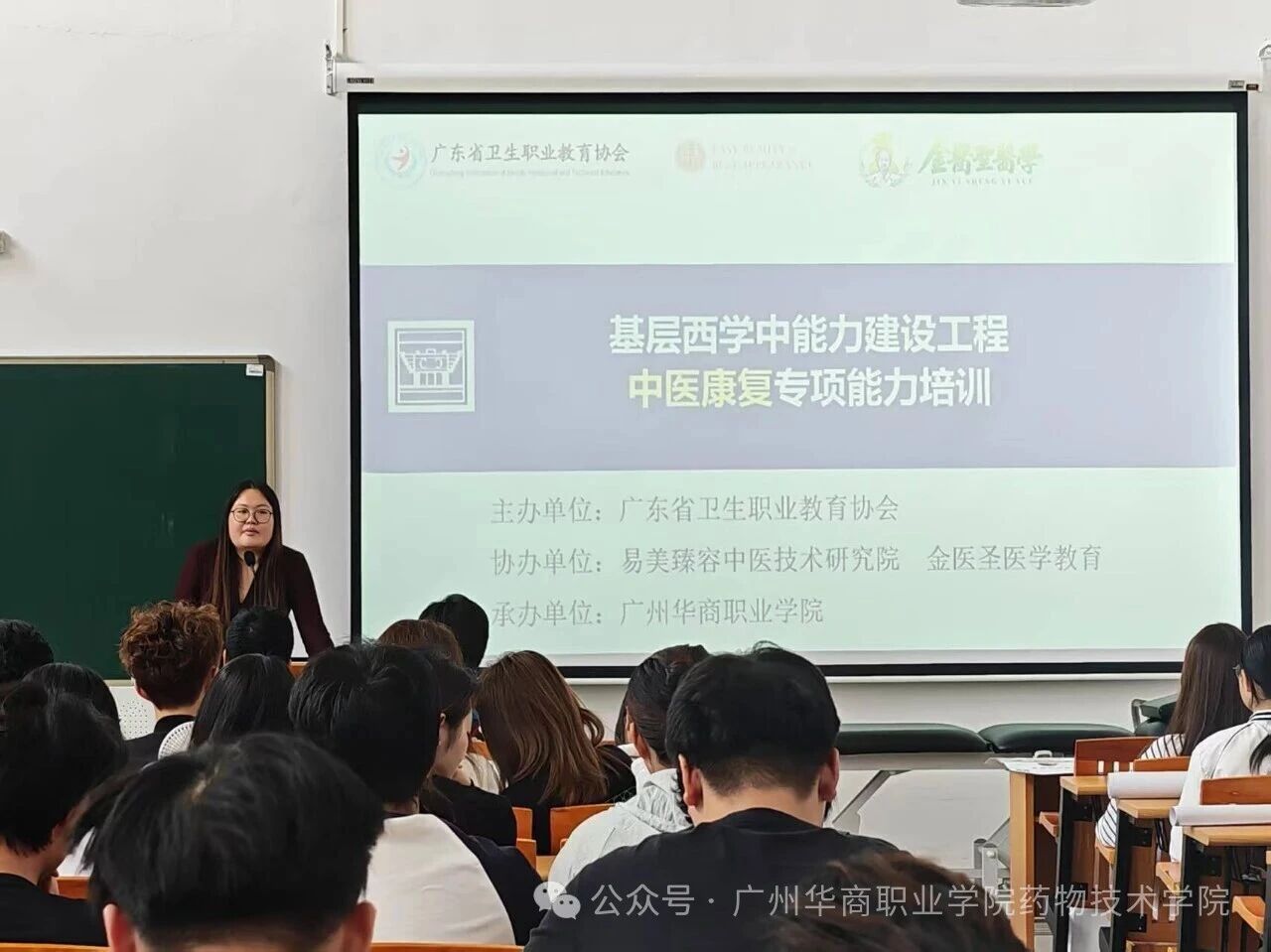 为提升学子专业素养,丰富中医康复相关技能储备,广东卫生职业教育协会走进广州华商职业学院(江门校区),于2026年3月18日周三下午在文科楼416教室开展中医康复西学中技能培训线下讲座。
