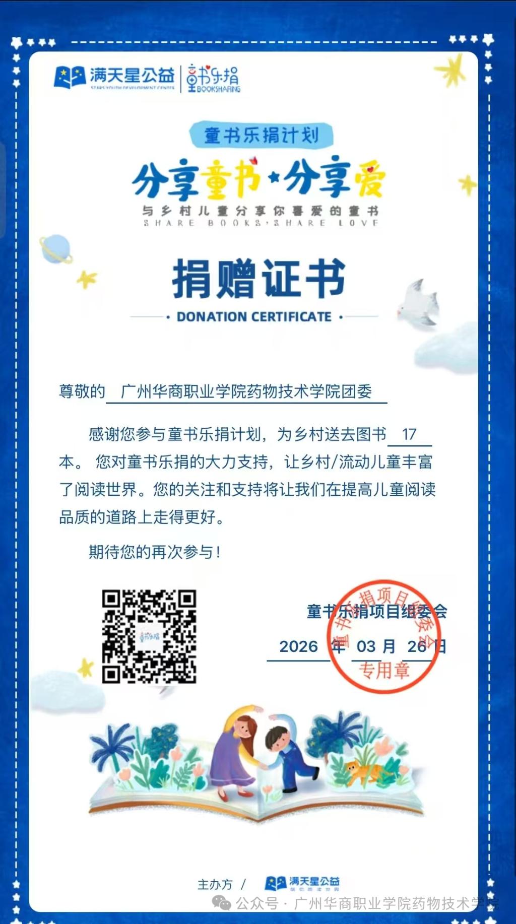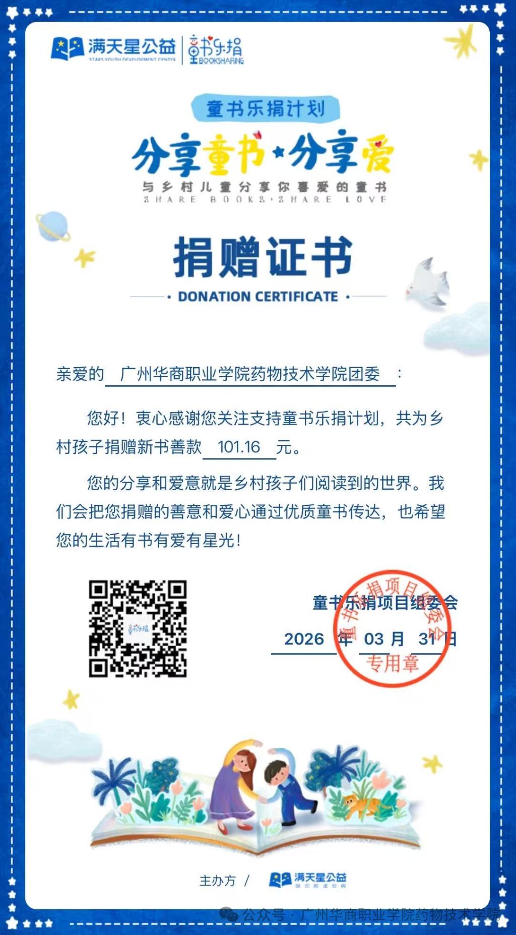活动后续,童书乐捐计划持续落地,我院团委累计为乡村儿童送达图书17本,并筹得善款101.16元。此次后续捐赠不仅让闲置的童书跨越山海,抵达乡村孩子的书桌,更让书香与善意在公益链条中持续传递。同学们的爱心与行动切实助力乡村儿童丰富阅读世界,让知识的力量照亮成长之路,也让校园里的公益理念在真实的社会反馈中落地生根、开花结果。